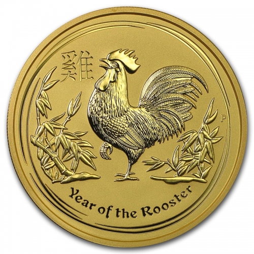 На реверсе золотой монеты Австралии "Лунный календарь 2 - Год Петуха" - изображение петуха, стоящего на одной лапе среди растений. Сверху - китайский иероглиф, означающий "петух", снизу - надпись на английском языке "Year of the Rooster" (Год Петуха).