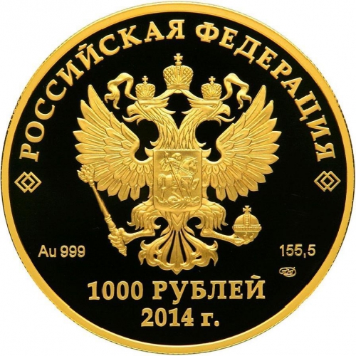 на зеркальном поле диска — рельефное изображение Государственного герба Российской Федерации, над ним вдоль канта — надпись полукругом: «РОССИЙСКАЯ ФЕДЕРАЦИЯ», внизу под гербом: слева — обозначения металла по Периодической системе элементов Д.И. Менделеева и пробы сплава, справа в две строки — обозначение массы драгоценного металла в чистоте и товарный знак Санкт-Петербургского монетного двора, внизу в центре в две строки — номинал монеты: «1000 РУБЛЕЙ» и дата: «2014 г.».