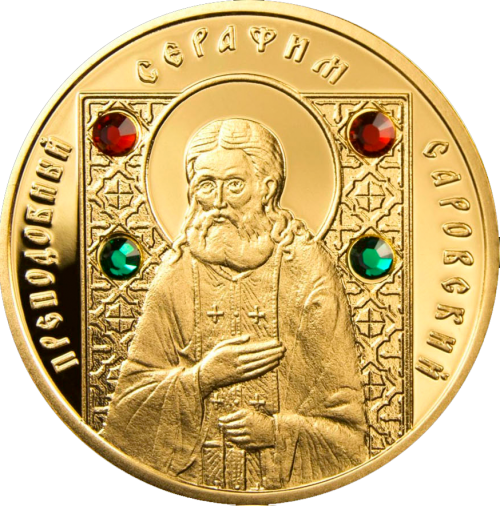 Реверс: вверху по кругу надпись: ПРЕПОДОБНЫЙ СЕРАФИМ САРОВСКИЙ; в центре – на фоне орнамента, применяемого в иконографии, со вставкой (четыре синтетических кристалла) – образ святого Преподобного Серафима Саровского.