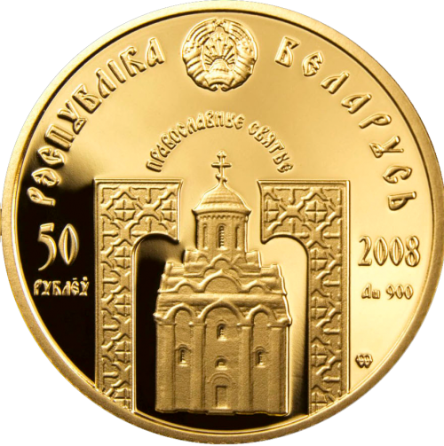 Аверс: вверху – рельефное изображение Государственного герба Республики Беларусь; в верхней части по кругу – надпись: РЭСПУБЛІКА БЕЛАРУСЬ; в центре по кругу надпись: ПРАВОСЛАВНЫЕ СВЯТЫЕ; под ней на фоне орнамента изображение макета–реконструкции Спасо – Преображенского храма в Полоцке; слева – номинал: 50 РУБЛЁЎ на золотой и 10 РУБЛЁЎ на серебряной; справа – год чеканки, проба сплава и фирменный (товарный) знак Монетного двора Польши.