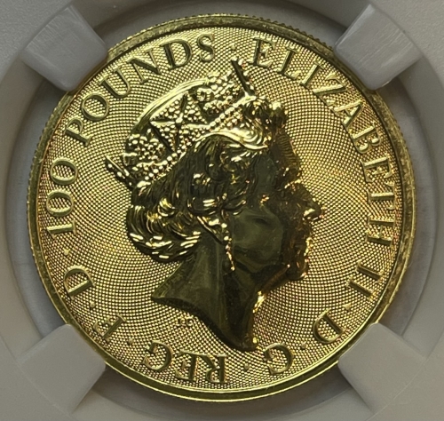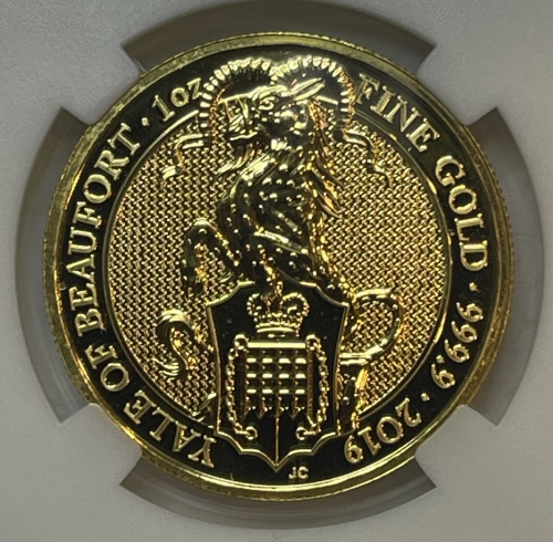 Золотая монета Великобритании 100 фунтов "Йель Бофорта" 2019 года 31,1 г. в слабе ННР MS 70